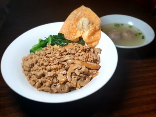 Our signature thin tubular egg noodle with sweet and savoury minced chicken. Served with 2x fish balls and boiled wonton.