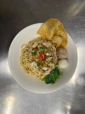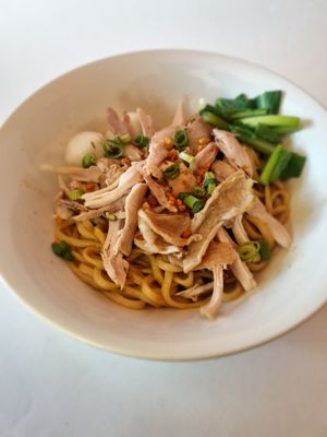 Large portion of our signature egg noodle with shredded hainanese chicken with 2ps of fish balls.